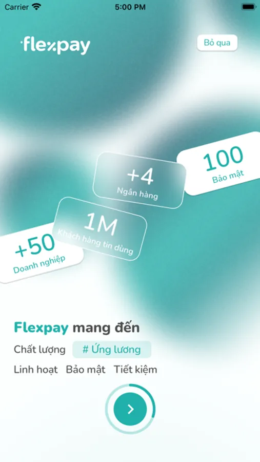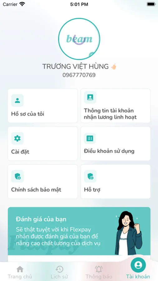 Flexpay là Phần mềm do Công ty phát triển, sở hữu và vận hành trên hệ điều hành iOS (Apple Store), cho phép Khách hàng (Người lao động của đối tác) khởi tạo, theo dõi và quản lý yêu cầu tiền lương hoạt động thông qua phần mềm Beam trên thiết bị di động có kết nối Internet.