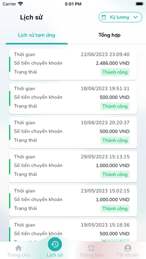 Theo dõi và quản lý toàn bộ các yêu cầu tạm ứng tiền lương (bao gồm các trạng thái: Đã gửi yêu cầu/Đã được phê duyệt/Đã được thanh toán tạm ứng/Trạng thái ứng lương (Thành công/Thất bại).