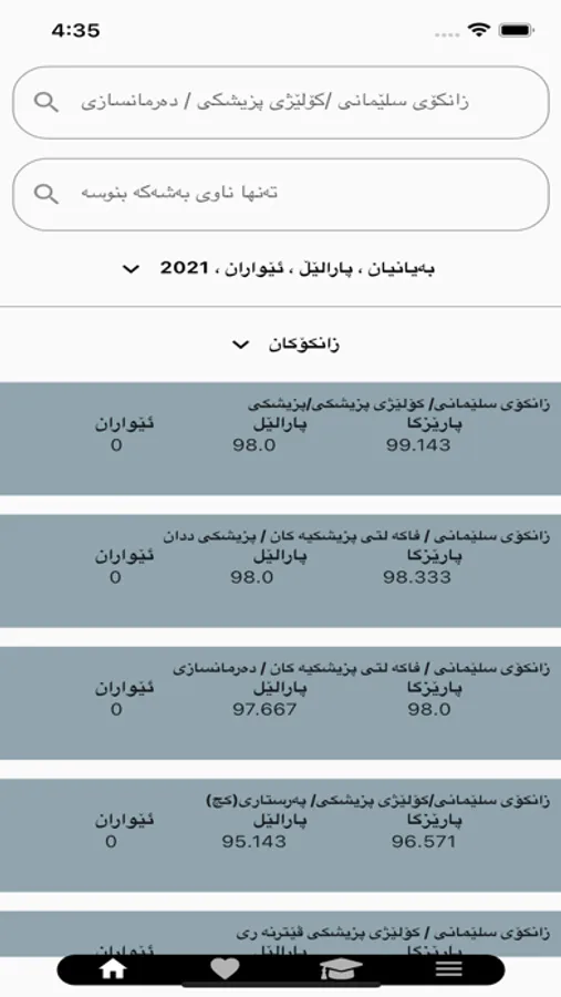 ٦- ڕیزبەندی بەپێی نمرەکەت : لەم بەشەدا خوێندکاران و قوتابیان دەتوانێت زانکۆکان دیاری بکات و کرتە لە ریزبەندی بکات سەرجەم ئەو بەشانەت بۆ ریز دەکات کە نمرەی تۆ وەردەگرن