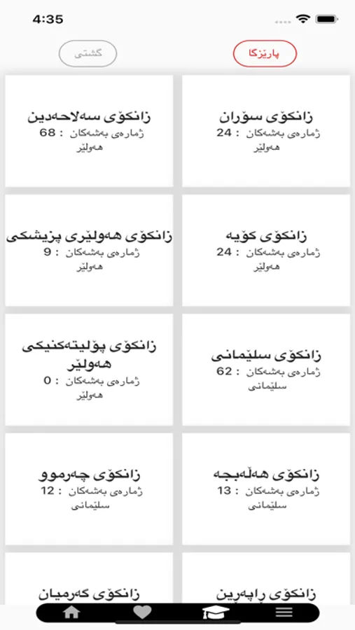 ١- زانکۆ و پەیمانگا حوکمییەکان : ئەم بەشە سەرجەم بەشەکان و کەمترین کۆنمرەکانی وەرگرتنی تێدایە وە هەژمار کردنی نمرەکەت بە کریدت و دیاری کردنی ئەو بەشانەی کە کۆنمرەکەی تۆ وەر ئەگرێت بە رەنگی جیاواز