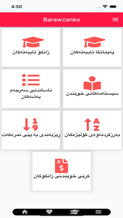 ٤- سیستەمەکانی خوێندن : لەم بەشەدا هەموو سیستەمەکانی وەرگرتنی خوێندکاران و قوتابیان رونکراوەتەوە