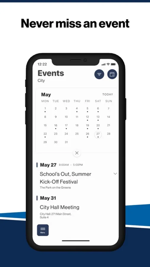 The event section shows a list of events throughout our community. Easily add an event to your own calendar and/or share the event with friends and family with one tap.