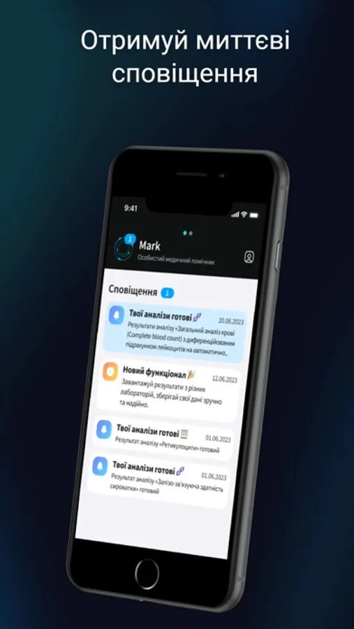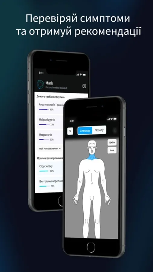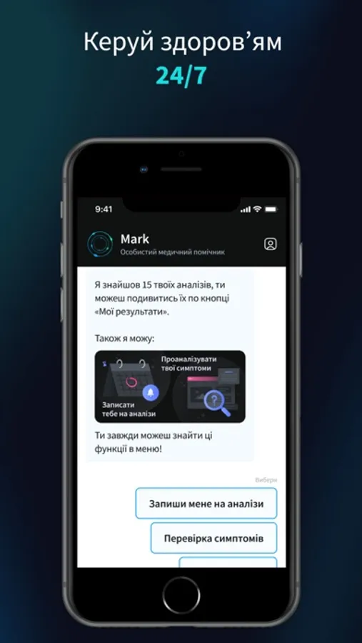 Віртуальний медичний помічник, який поруч 247. Mark професійно піклується про ваше здоров’я, своєчасно діагностує стан та запобігає загрозливі наслідки, зберігає та аналізує всю медичну інформацію, допомагає записатись у клініку чи лабораторію, вчасно нагадує про візит до лікаря чи приймання ліків.