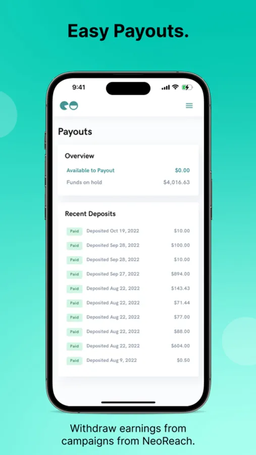 The NeoReach Creator portal app is for creators working with NeoReach to signup / login, view campaign statuses, view payment statuses, and transfer funds to your bank account. Get notified when campaign statuses update and when payments are made available to you and take the stress out of worrying about your campaign payment statuses.