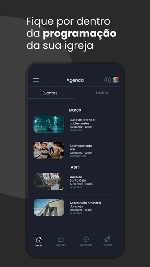 Recursos disponíveis no Aplicativo: Notícias, Agenda da igreja, Eventos, Conteúdos, Projetos, Transmissão ao Vivo e Módulo Ensino.