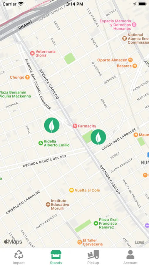 Podrás ver el seguimiento del camión con tus residuos, como también podrás visualizar los stands de reciclaje cerca tuyo.