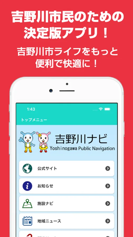吉野川ナビは、吉野川市民のための生活情報アプリです。「暮らしに便利な情報を通知」「地域ニュースや最新の行政情報」「公共施設等へのナビ」など情報満載!