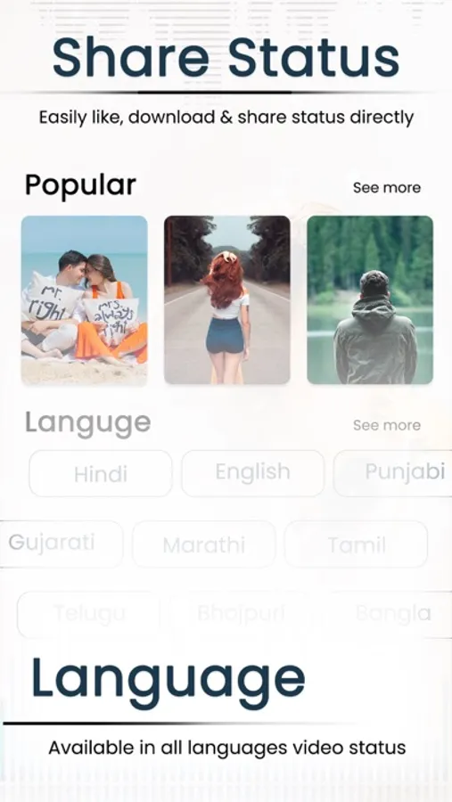 Multiple Language : Would you like to download free status video in Hindi, English, Gujarati, Marathi, Punjabi, Tamil, Telugu, Kannada, Bengali, Malayalam, Bhojpuri, Haryanvi, Bangla, Odia and many more status video.