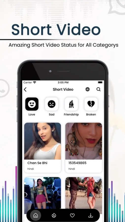 Search Videos : You will search the specific status video status, video song, artist, movie, language and category name just hit and the search button and find it.