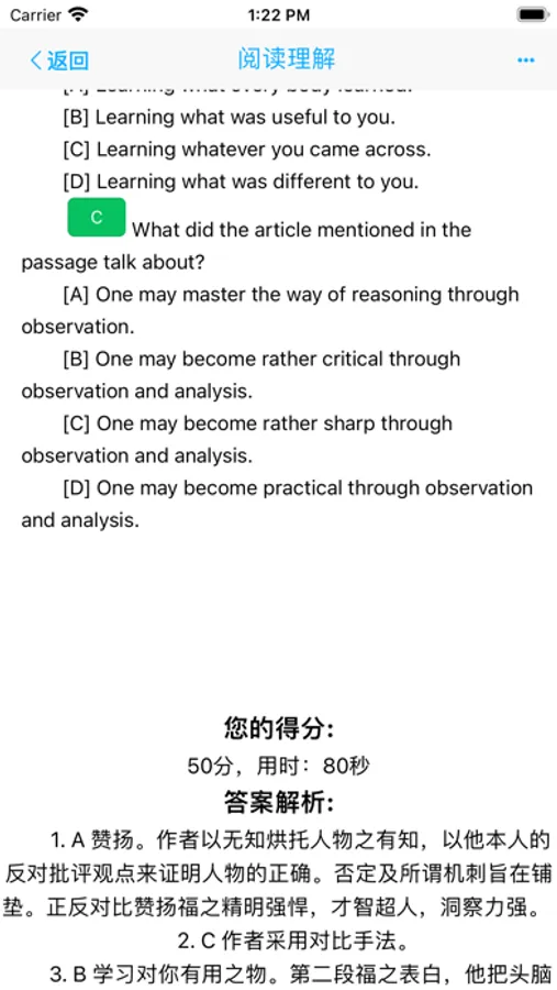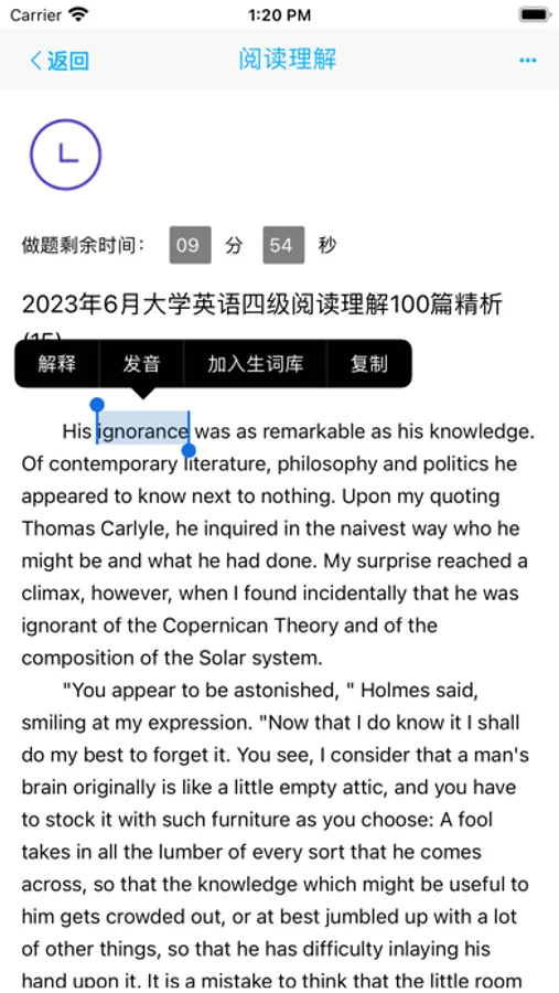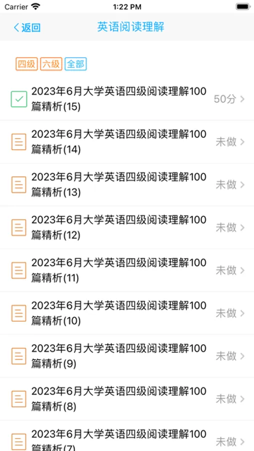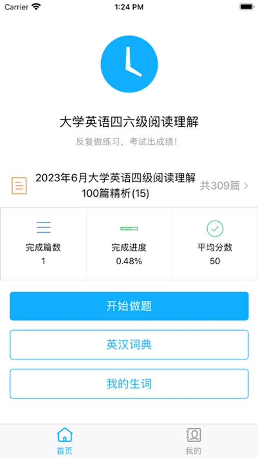大学英语四六级考试的重点是阅读理解, 只有通过不断地练习做题和积累单词才能提高。本App精选了几百篇大学英语四级和六级阅读理解习题, 在规定时间内模拟真实的考试练习,并配有答案解析。通过做题时把陌生的单词词组加入自定义的生词库反复地复习巩固, 从而扩充词汇量, 提升自己的英语水平,考试时自然能轻松应对!