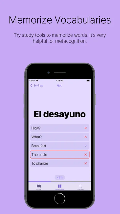 3. All basic functions such as covering meaning, memo, word-meaning swap, and voabularies mixing are implemented.