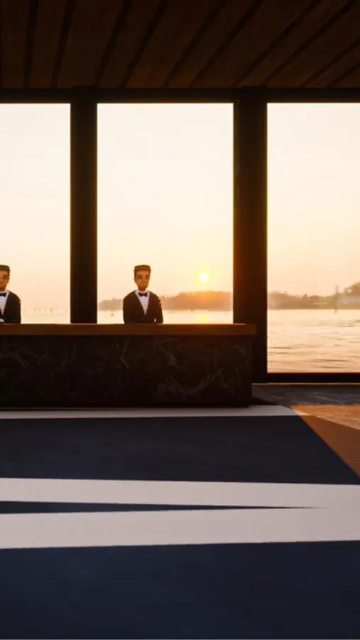 The sound of quiet waves, a balcony overlooking the sunset, the horizon stretching out across the whole window.