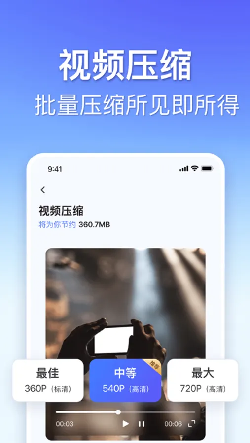 —支持多种规格的视频压缩,让您的手机空间得到更好的利用,同时支持不同分辨率的压缩选择,帮助您避免过度占用手机存储空间!