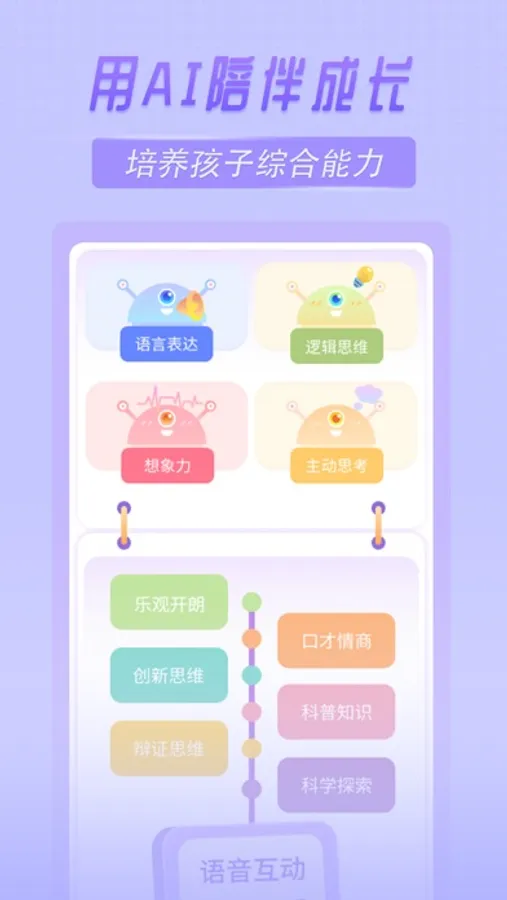 《晓悟故事》采用了全球领先的人工智能聊天机器人技术,并首创了语音对话形式的儿童互动阅读新体验。通过与故事中的人物对话互动,孩子不仅可以学到各种有用的知识,还可以快速提升语言表达能力、逻辑思维能力、想象能力、主动思考能力、统筹规划能力,培养开朗乐观的性格,助力情商智商全方位发展。