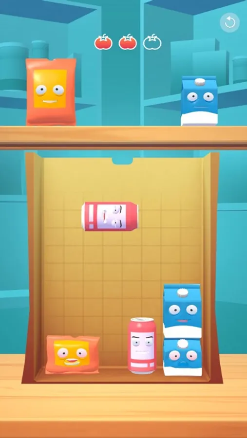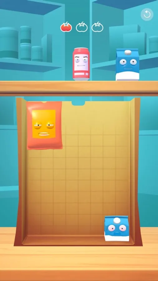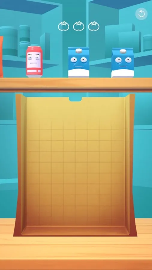 Place and rotate groceries in the bag while being careful not to crush them with the heavy ones. How much can you fit in the bag? Test your skills, stack the groceries in the most effective way.