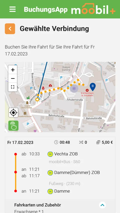 Wenn Sie Start- und/ oder Zieladressen eingeben zeigt Ihnen die Kartenoption immer die komplette Route. So werden bspw. auch die Fußwege zur nächsten Haltestelle abgebildet und Sie finden im Handumdrehen ihr Ziel.