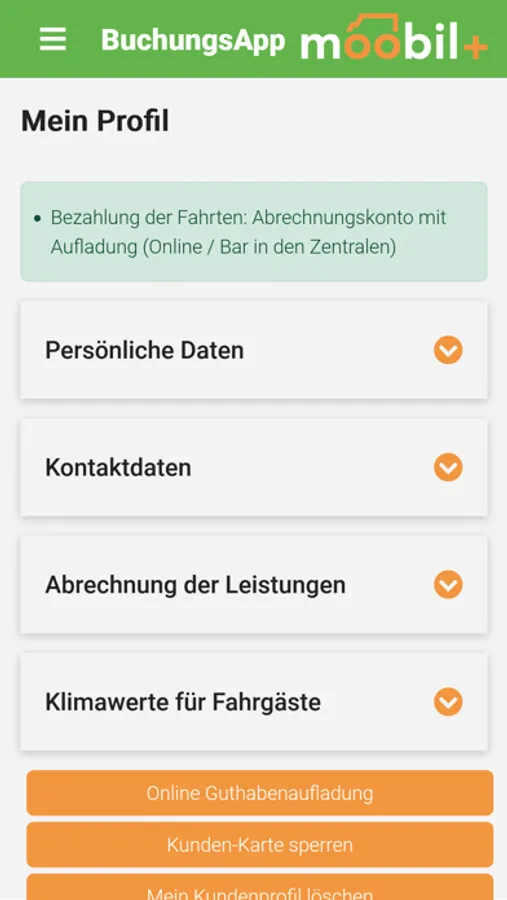Unsere App vereinfacht die Verwaltung ihres Profils enorm. Sie können jederzeit ihre persönlichen Daten einsehen oder ändern. Zudem lassen sich ihre Fahrtbuchungen leicht aufrufen, umbuchen und stornieren. Ebenso können Sie sich jederzeit ihren QR-Code anzeigen lassen. Auch ihre favorisierten Verbindungen können Sie speichern.