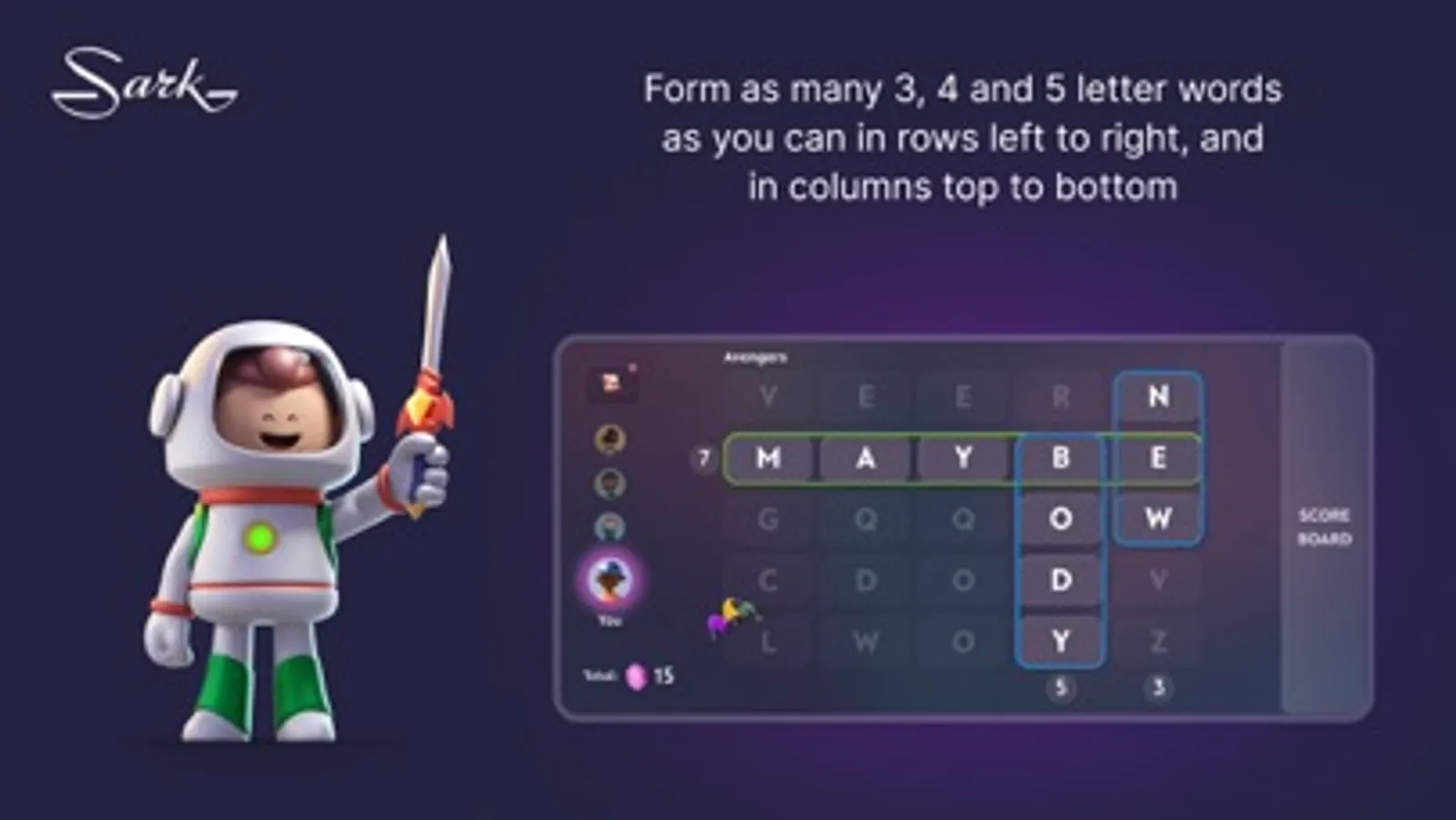 Sark is an addictive game for people who love creativity and logical thinking. 25 letter cards are dealt, one at a time, and players use the letters to form 3, 4 and 5 letter words in a 5x5 matrix. It’s the same game for each player, and there’s no “erasing”—once you place a letter, it’s played! Take the challenge and try Sark today!