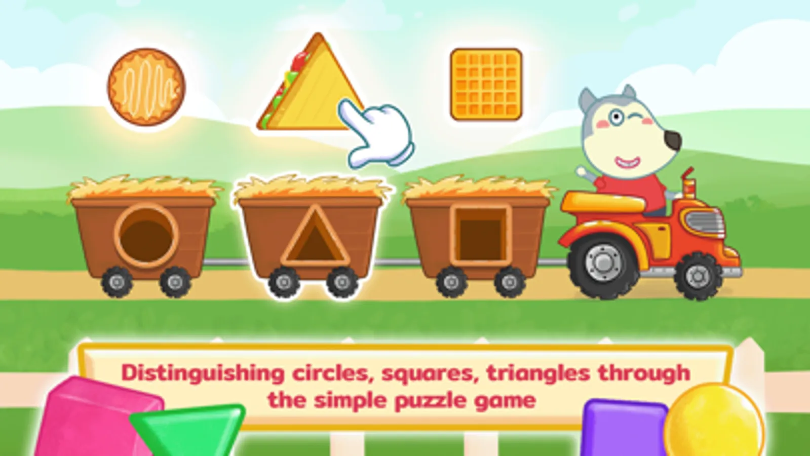 Game 1 - Farm Work: Help Wolfoo arrange food and objects in square - circle - triangle shapes onto the cart