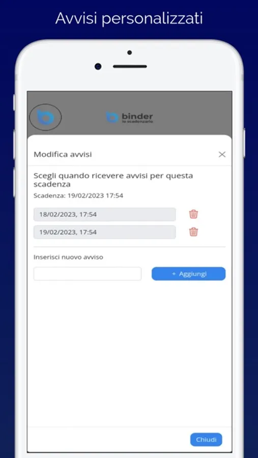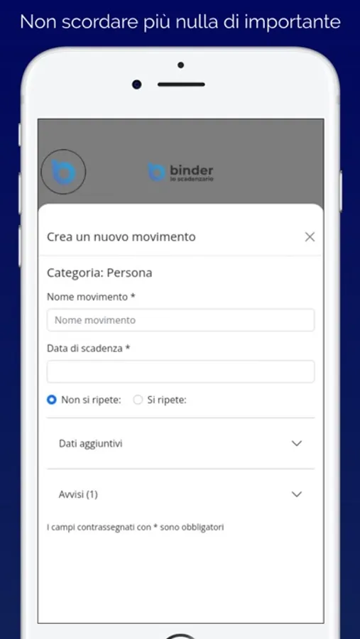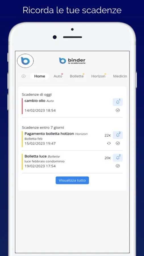 Con Binder, la gestione delle scadenze non è mai stata così facile. La sua interfaccia elegante e moderna rende la gestione delle scadenze un'esperienza piacevole e rilassante. Che tu debba ricordare di pagare l'affitto o di organizzare una festa di compleanno, Binder è l'applicazione ideale per te. Non dovrai più preoccuparti di dimenticare una scadenza importante grazie alle notifiche personalizzabili e alle funzioni avanzate.
