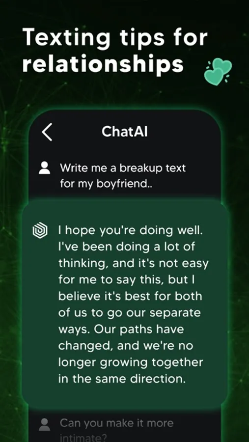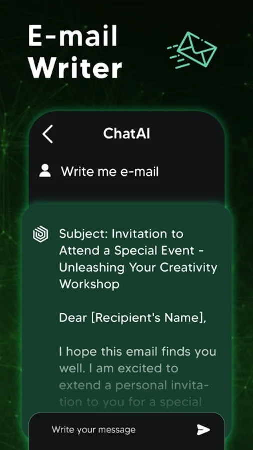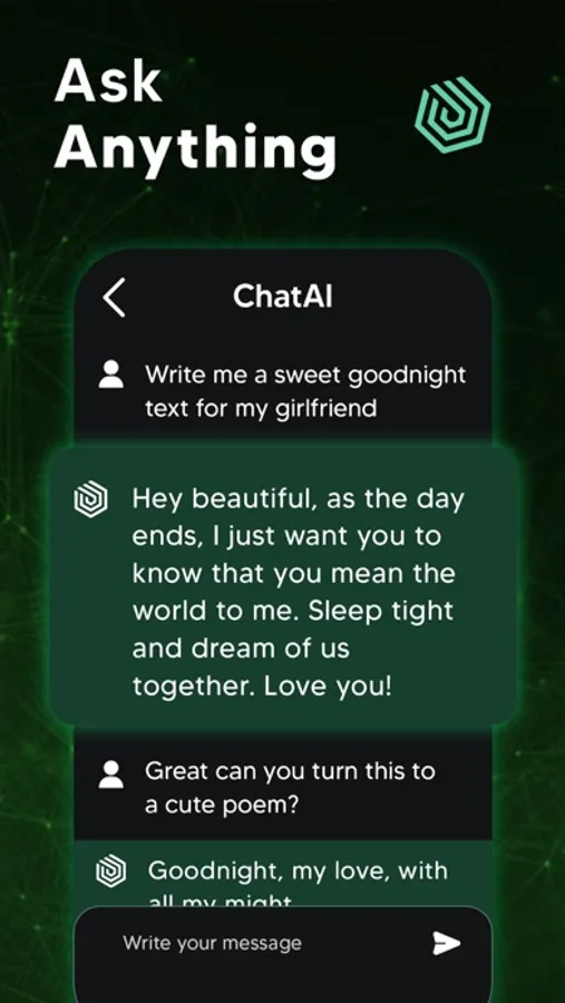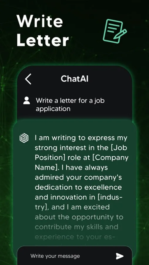 Do you need to write long content (essays, emails, articles, poems etc.) or do you want to have rechecked what you wrote? ChatAI is here to meet your needs! The intelligent chatbot app ChatAI will connect you to a world of unique text possibilities. You will be amazed by its “write for me“ and “grammar check” capabilities based on the advanced natural language processing technology.