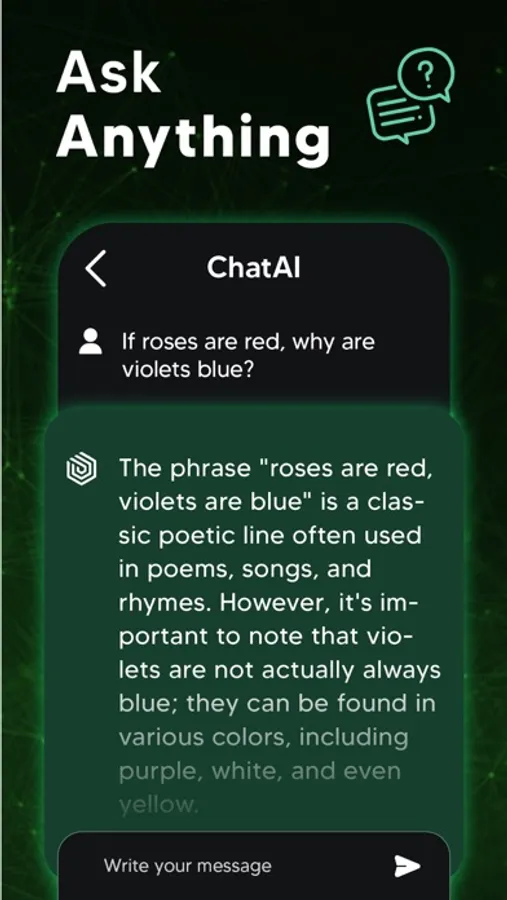 ChatAI is your in-pocket source for chatting about any topic you want. Whether you’re interested in sports, love, languages, mysteries, science, or anything else, ChatAI is always up for a chat.