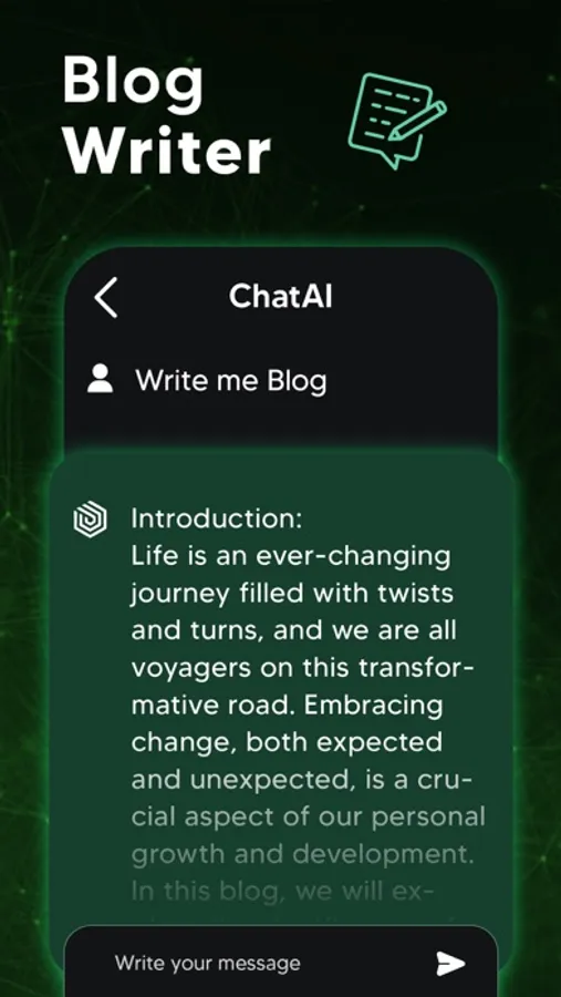 ChatAI is a revolutionary writer app that can understand and respond to your needs as if you had a real assistant. With its advanced natural language processing technology, ChatAI can provide you with an unlimited number of creative texts!