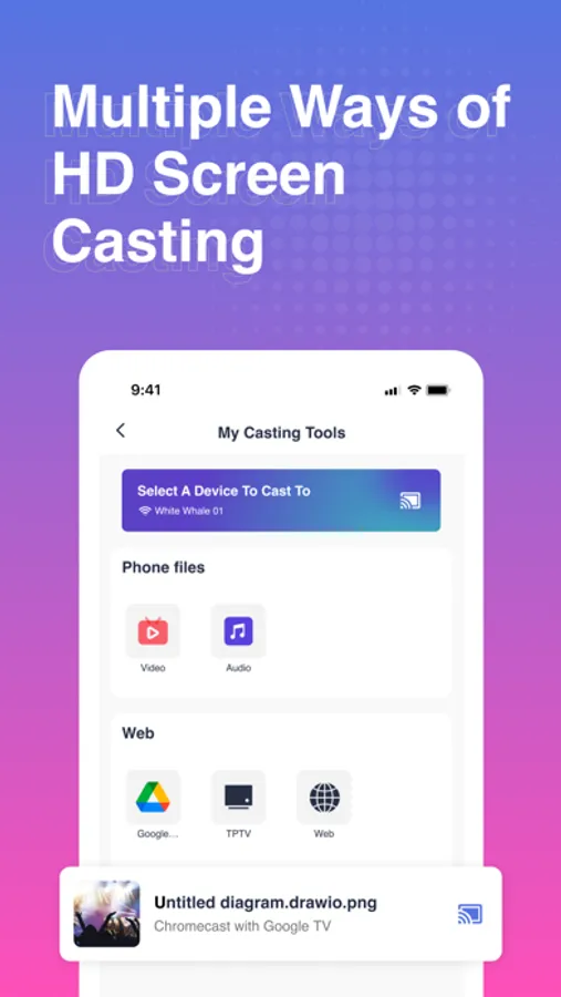 There are a variety of casting methods for you to choose from. You can cast local media files, Google Drive files, an IPTV playback address, or a network playback address.