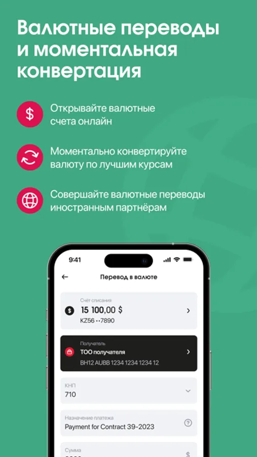 • Совершайте мгновенные переводы вашим бизнес-партнёрам в тенге и в валюте