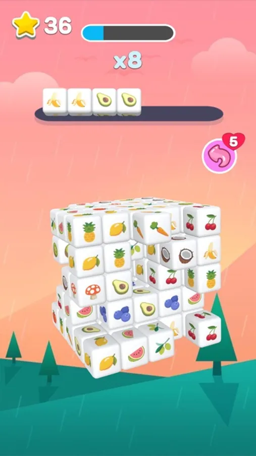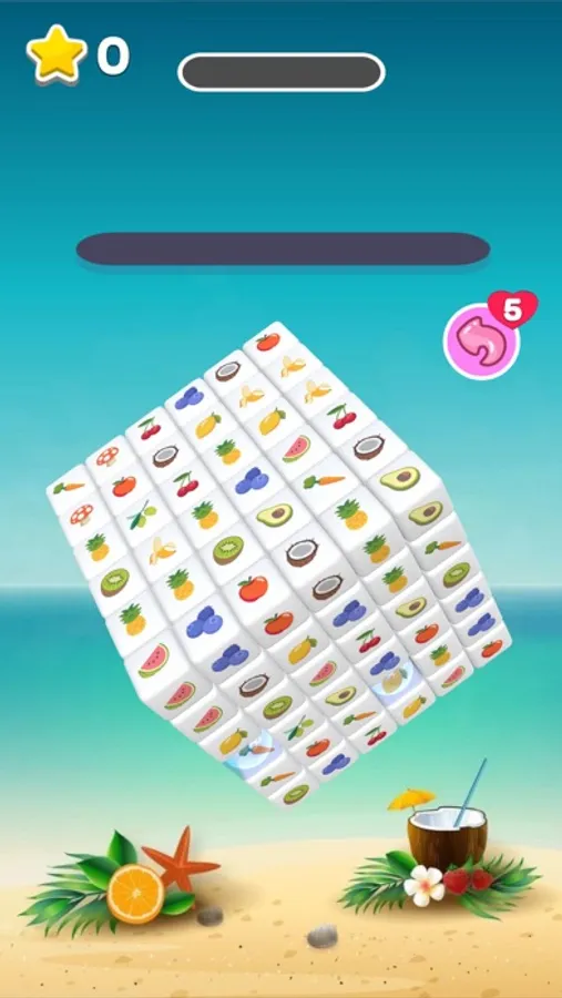Match the fruits as 3's, solve the puzzle, and clear the Cube.