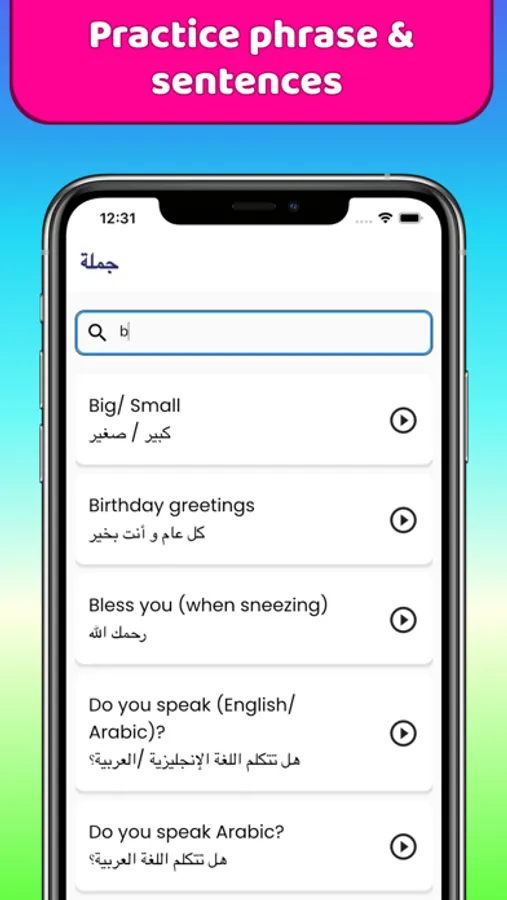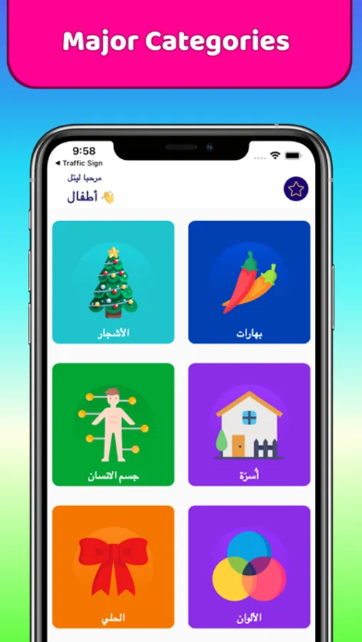Vocabulary lessons: The app can introduce children to basic Arabic words and phrases, such as greetings, numbers, colors, and animals, through object images and pronunciation.