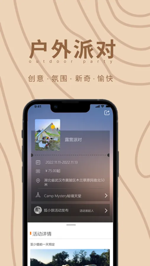 狐小旅是一款一站式露营服务平台,在这里有志同道合的露营爱好者分享露营经验和露营攻略,可以手把手教你学会户外露营,找到你想要的露营基地和露营装备。