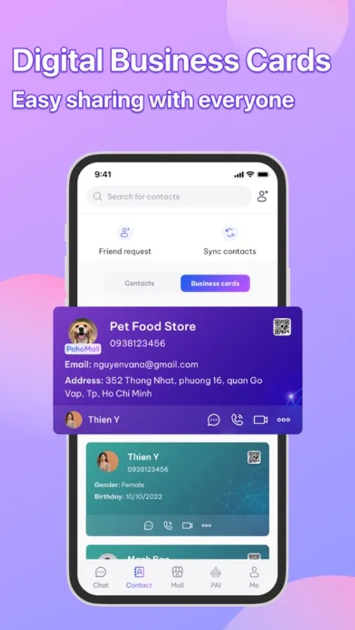 With POHO, you can easily manage and share information about your friends, family, and business contacts in a convenient electronic address book. Beyond regular text messages, POHO also allows you to send location-based messages, voice messages, business cards, and products, enabling diverse and rich communication.