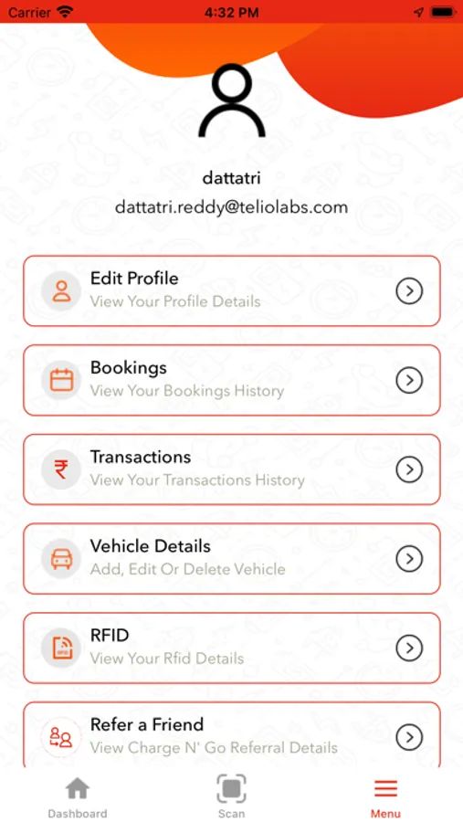 Interactive menu in the EV charging app