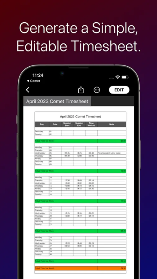 Gone are the days of manual calculations and tedious paperwork. Comet empowers you to generate monthly hour reports effortlessly. Export your timesheets as XLSX files, compatible with popular applications like Numbers, Excel, and more. Now you can seamlessly collaborate and share your data across platforms.