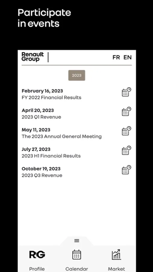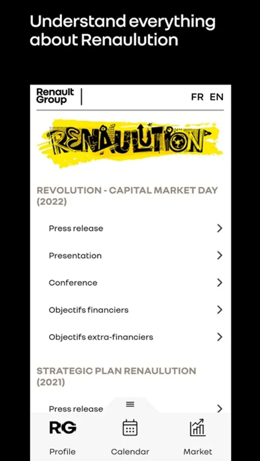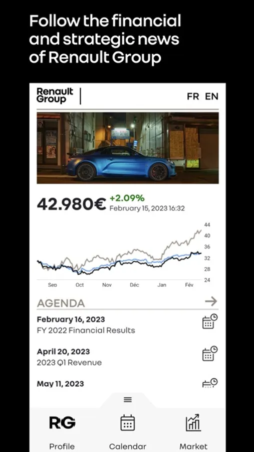 The Renault Group Invest'R application allows investors, analysts, individual shareholders and the media to get information and follow Renault Group's financial news in real time.