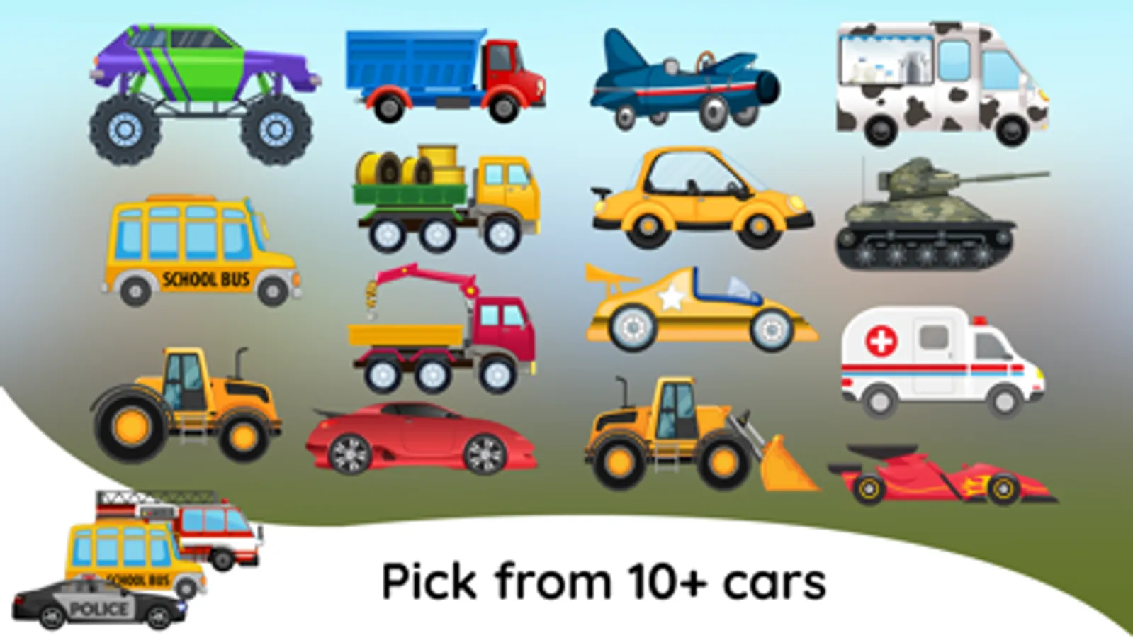 Get ready for a fun and exciting adventure with our mobile game for kids, where you can wash, service, and ride in your favorite cars! Choose from over 10 different vehicles, including sports cars, trucks, and more. Start off by giving your chosen vehicle a good scrub down in the car wash. Once it's sparkling clean, head over to the garage for a complete service and tune-up. After that, take your car for a spin on the open road and explore the colorful and vibrant game world. With endless possibilities and hours of entertainment, this game is sure to become a favorite for car-loving kids everywhere!