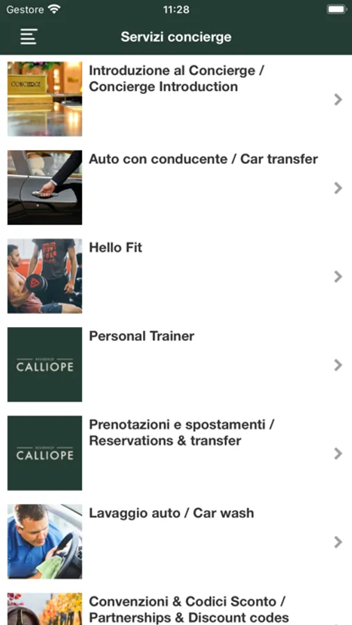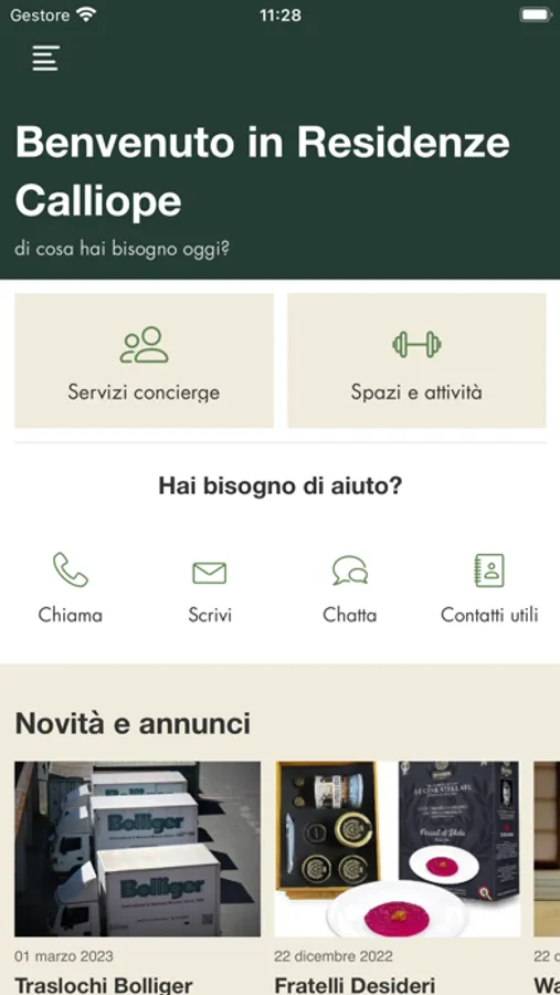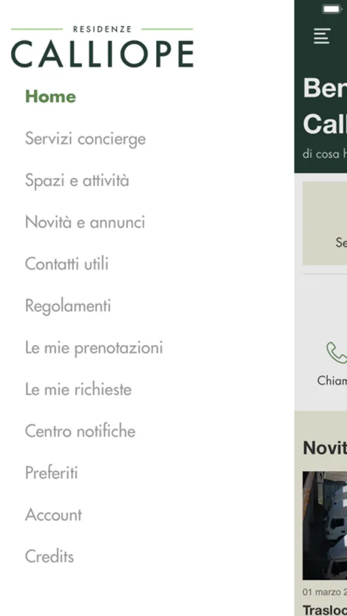 App per visualizzare servizi, attività e spazi presso Parco Leonardo e Residenze Calliope, effettuare prenotazioni e contattare il Concierge.
