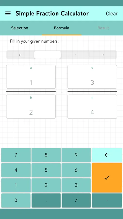 - depending on the topic, negative values, decimal numbers, fractions and π are supported