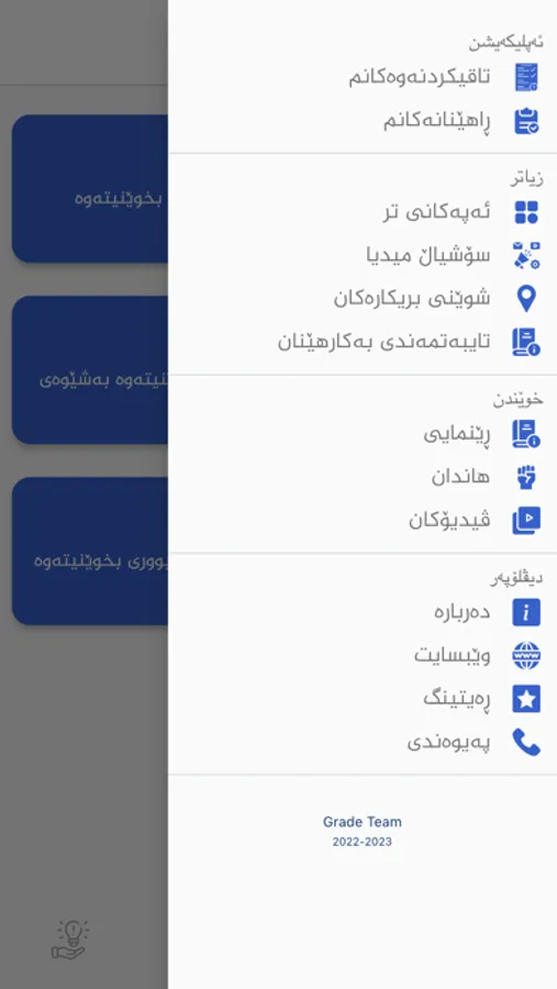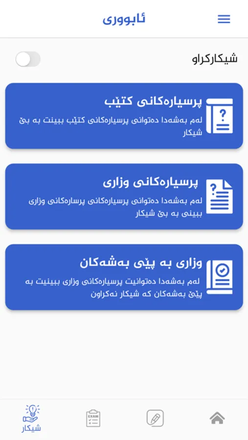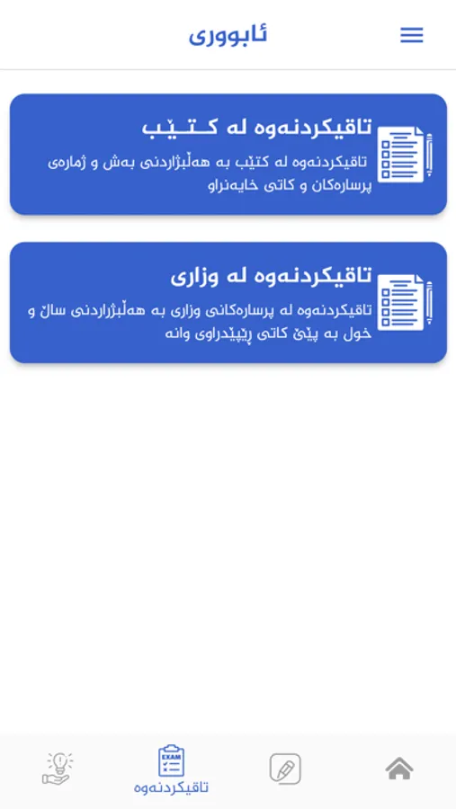 بەشی تاقیکردنەوە : ئەم بەشە تایبەتە بە ئەنجامدانی تاقیکردنەوە لەسەر پرسیارە گرنگەکانی ناو کتێب بە هەڵبژرادنی بەش و ژمارەی ئەو پرسیارەکان و کاتی تاقیکردنەوە، هەروەها تاقیکردنەوە لە پرسیارەکانی وزاری بە شێوەی هەڵبژراردنی ساڵ و خول (خولی یەکەم، خولی دووەم، بەرایی) وە کاتی تاقیکردنەوەی ئەزموونە گشتەکانمان لە وانەکە داناوە بۆ مۆدی تاقیکردنەوەی پرسیارەکانی وزاری بۆ ئەوەی قوتابیان و خوێندکاران وا هەست بکەن و ئەزموون بکەن کە لە تاقیکردنەوەی ئەزموونە گشتیەکاندان.