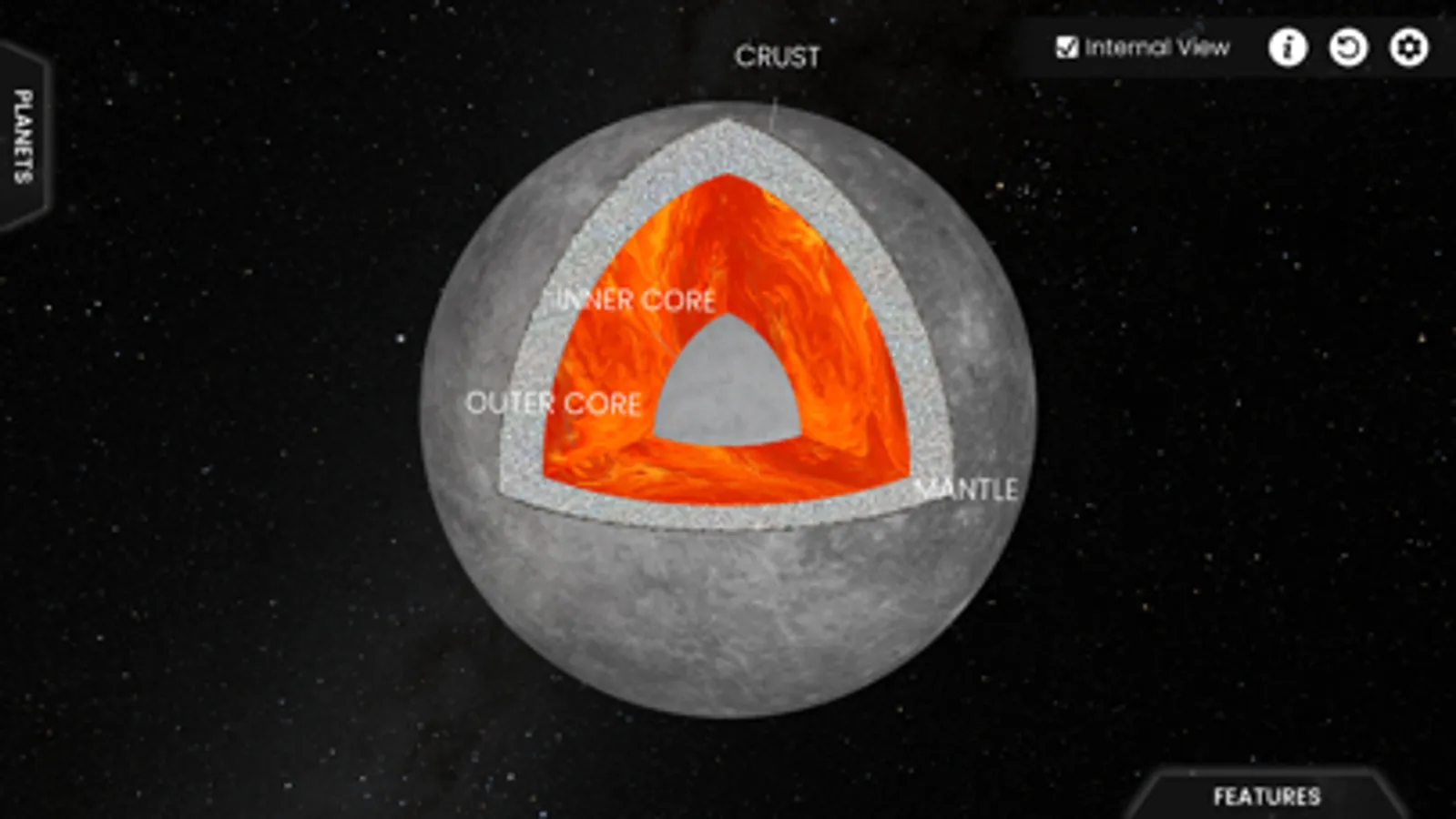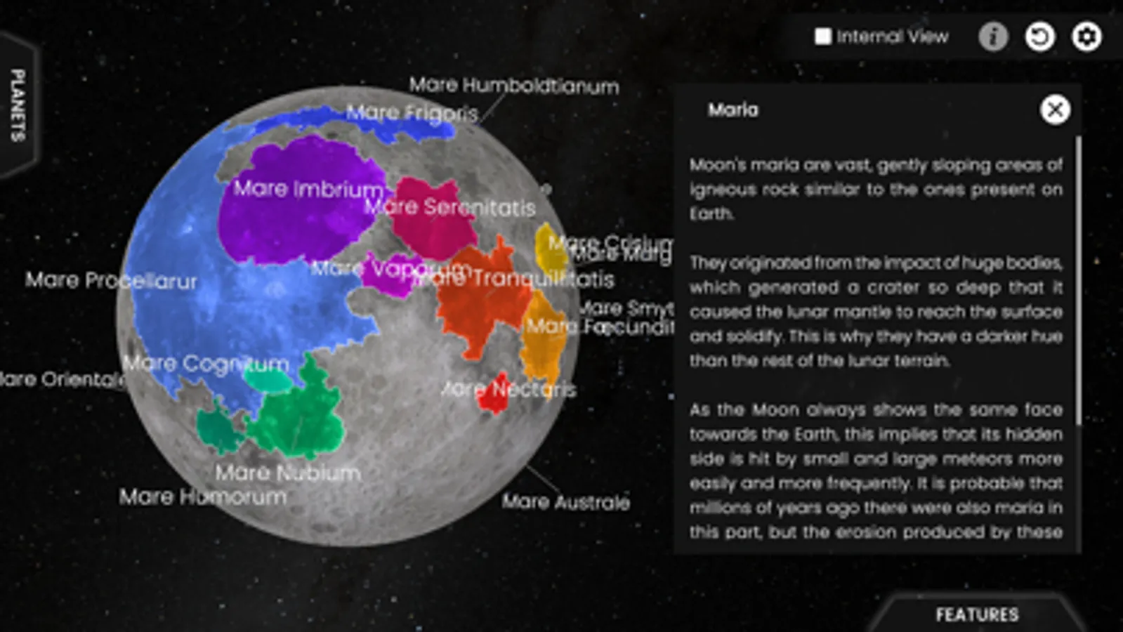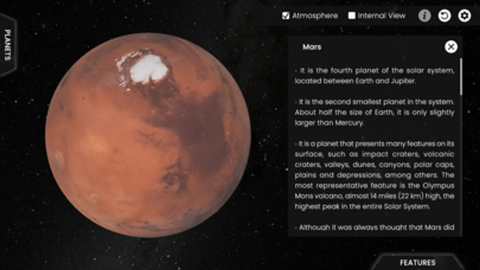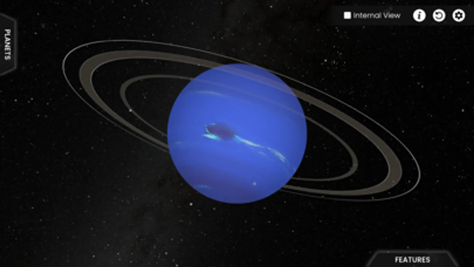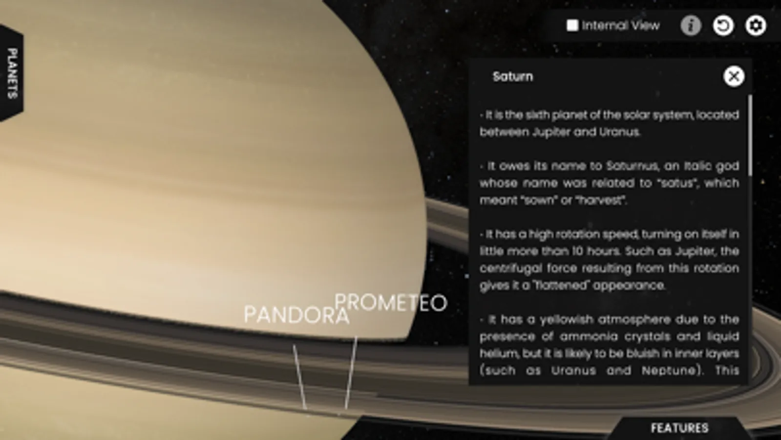 The models represented have been designed taking care of the maximum possible realism, from the true color of the surface of Venus, to the structure of the ring systems. In this way, you have the feeling of visiting each planet only a few thousand kilometers away.