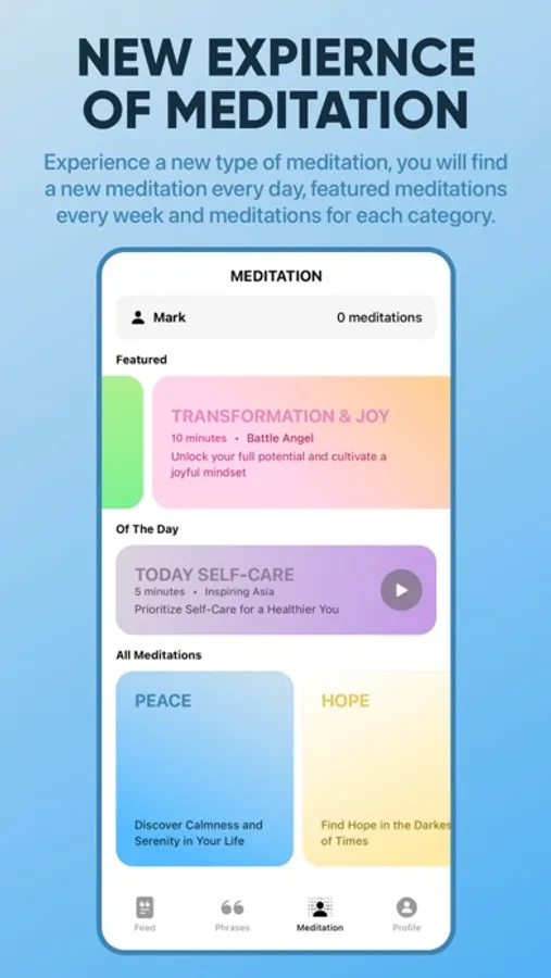 - Featured Meditation: Featured meditations every week, which combines phrases from multiple categories for a truly transformative experience. These meditations are designed to help you connect with your inner wisdom, find clarity and direction, and tap into your highest potential.