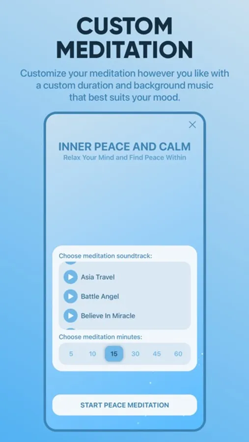 - Customizable Meditations: Meditations for each category, with spoken phrases, customizable duration, and background music. You can choose the duration of your meditation, from as little as 5 minutes to as long as an hour, and select the background music that best suits your mood.