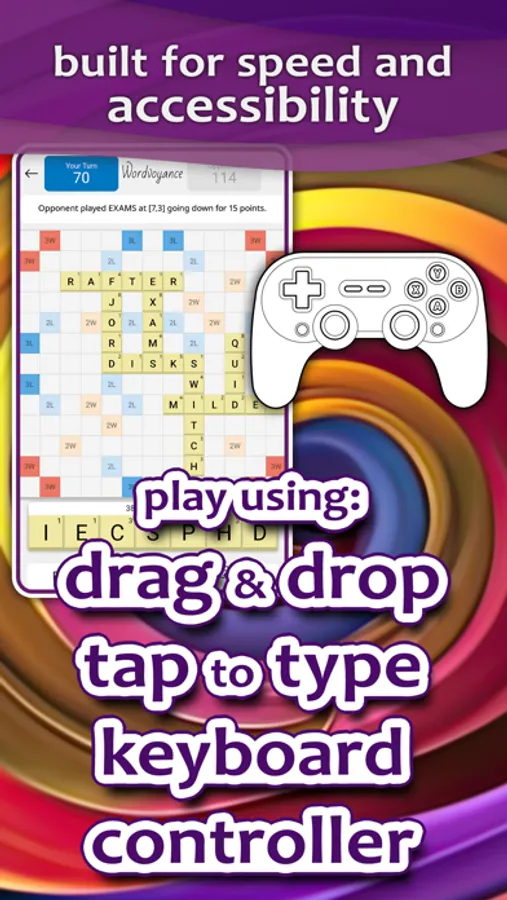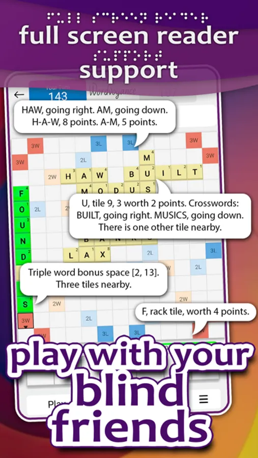 This iOS App version of Wordvoyance supports additional gestures and accessibility shortcuts that make it so much easier to play. Quickly check your work and submit your turn with a Magic Tap. Three-finger scroll left and right between the beginnings of words on the board. Swipe between headings to hop between the game board, tile rack, and all of the game's additional game status readouts. Use the Escape gesture to quickly close dialogs and reclaim tiles from play.