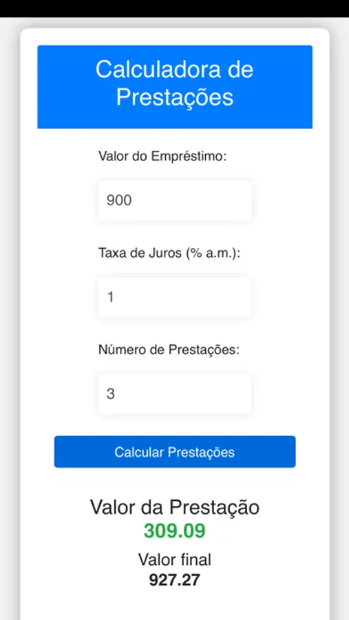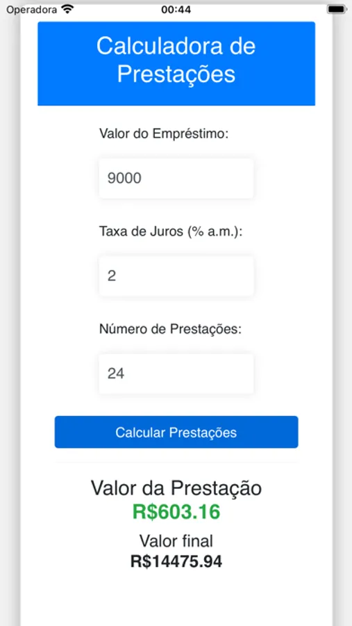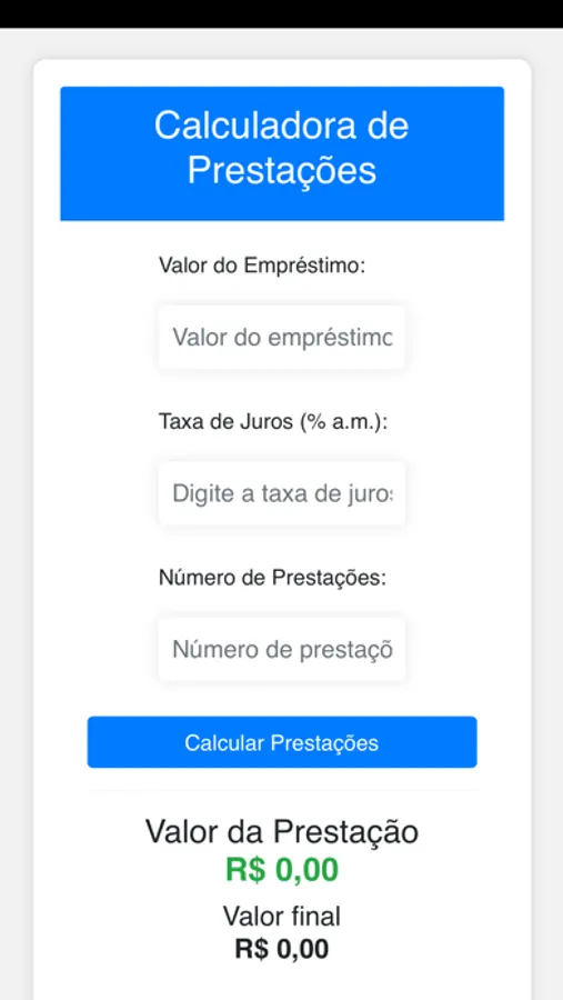 A Calculadora de Prestações é um aplicativo fácil de usar que permite que você calcule parcelas de empréstimos, financiamentos e compras parceladas de forma rápida e precisa. Com uma interface simples e intuitiva, você pode inserir as informações necessárias, como o valor total, o número de parcelas e a taxa de juros, e obter o valor das parcelas em segundos.