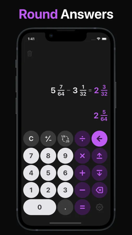 Easily round answers to the precision that suits your needs. Options for rounding include: 1, 1/2, 1/4, 1/16, 1/32, 1/64. One16 retails answer precision when doing a new equation to eliminate compounding errors.