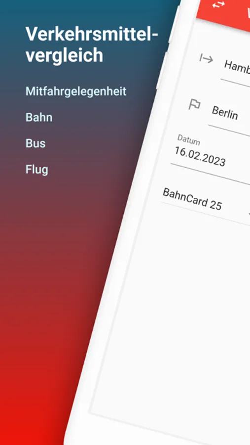 Mit Verkehrsmittelvergleich können Sie ganz einfach und schnell die besten Verbindungen im Fernverkehr finden! Unsere App unterstützt alle wichtigen Verkehrsmittel, einschließlich Bahn, Bus, Flug und Mitfahrgelegenheiten/Carsharing.