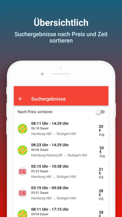 • Verbindungen nach Abfahrts- oder Ankunftszeit sortieren