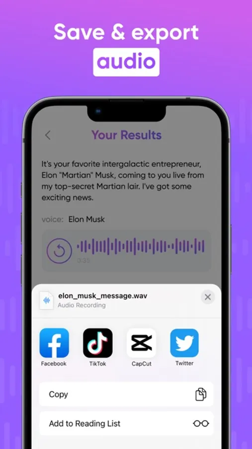 One of the standout features of our app is its ability to create natural-sounding speech that is virtually indistinguishable from human speech. Our advanced AI technologies generate high-quality and realistic audio that will bring your videos and texts to life. And you can customize the output to suit your needs, whether you're looking to create voice-overs for videos or you simply want to listen to long texts in a natural and engaging format.