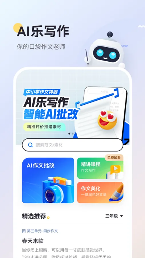 AI乐写作是一款聚焦中小学写作场景,专为中小学生和老师量身定制的智能解决方案,通过AI智能分析学生写作能力,定制个性化的学习方案,帮助学生轻松写出一手好文。
